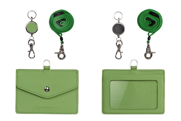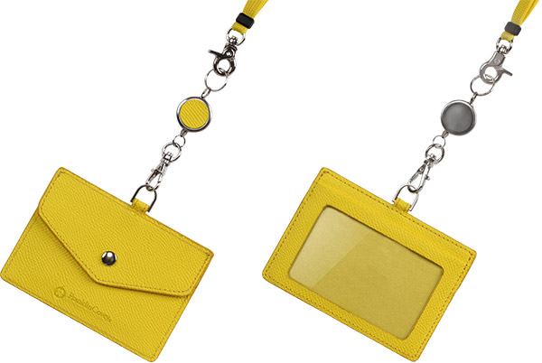 ベルトの金具がワンポイントのビビッドな色合いのフラップ、リール付IDケースです。フラップとはIDケースの裏側のボタン付きポケットです。名刺やカード入れなどにご活用いただけます。