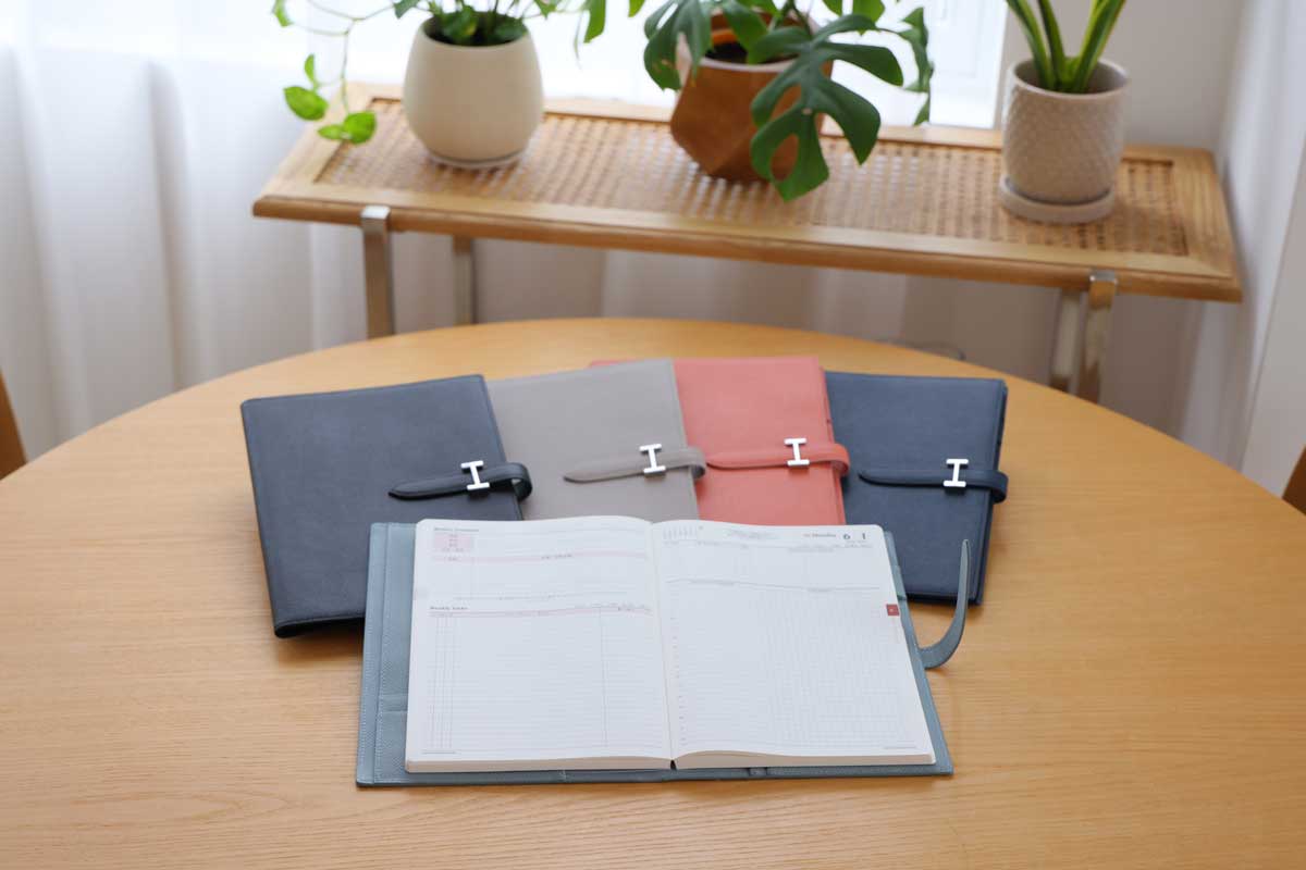 ライフスタイルに合わせて、スケジュールページのレイアウト(1日1ページ、ウィークリー)、サイズ(スリム、A5、B6)、デザインによってお選びください。