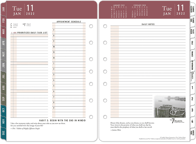 デイリーページは、1日分のスケジュール・タスク管理、ノート欄が見開き2ページで構成されている、フランクリン・プランナーで最もスタンダードなタイプです。日々の予定やタスクが多い方、メモをとる機会が多い方に人気があります。